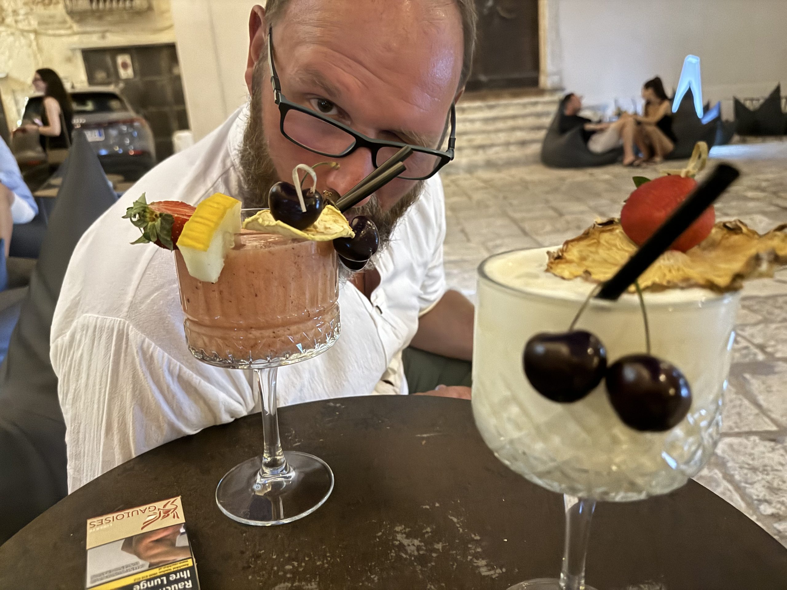 Ganz besonders war ein Lokal, das erstmal nicht nach einem solchen aussah. Ein paar Leute saßen draußen in diesen Sitzsäcken an kleinen Tischen. Als wir begriffen haben wie das hier läuft ließen wir uns in so einen Sack nieder und blieben den ganzen Abend. Ganz gechillt.