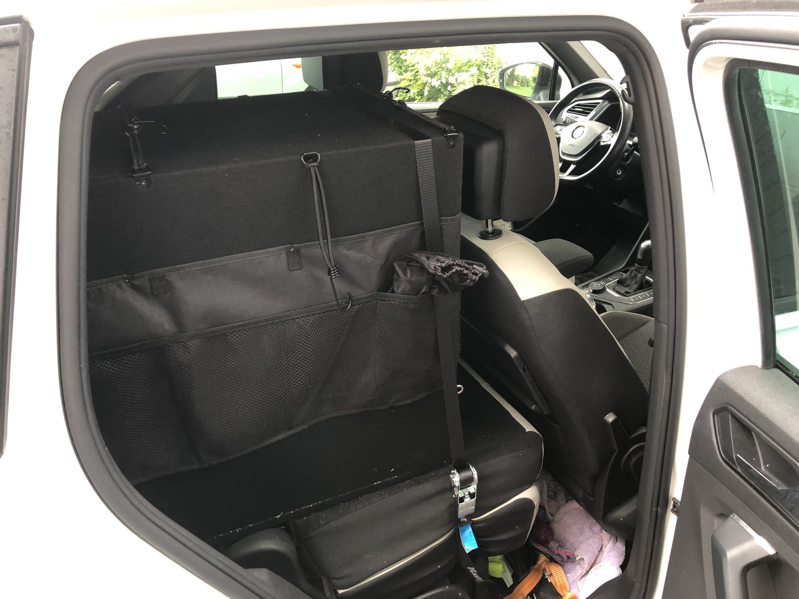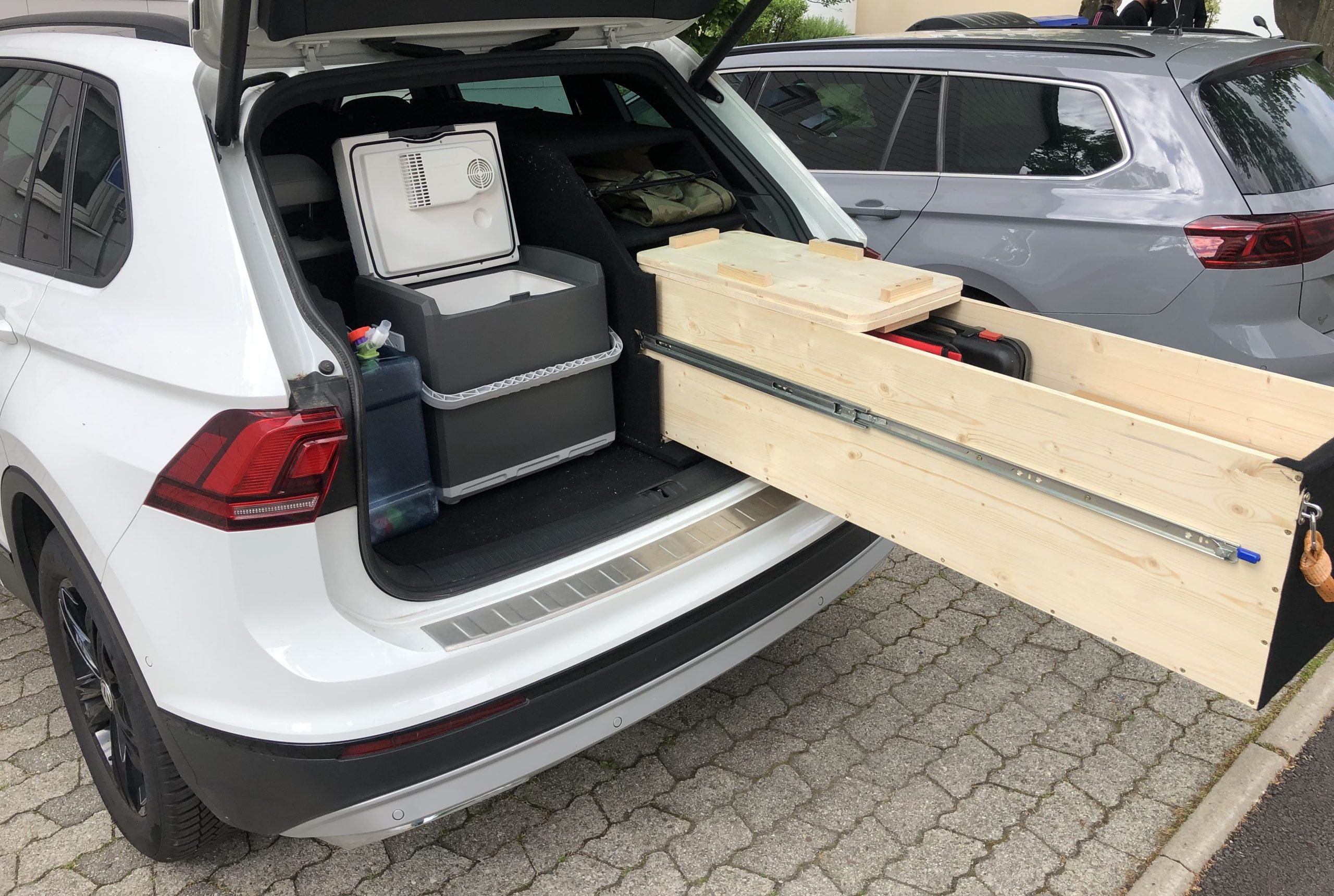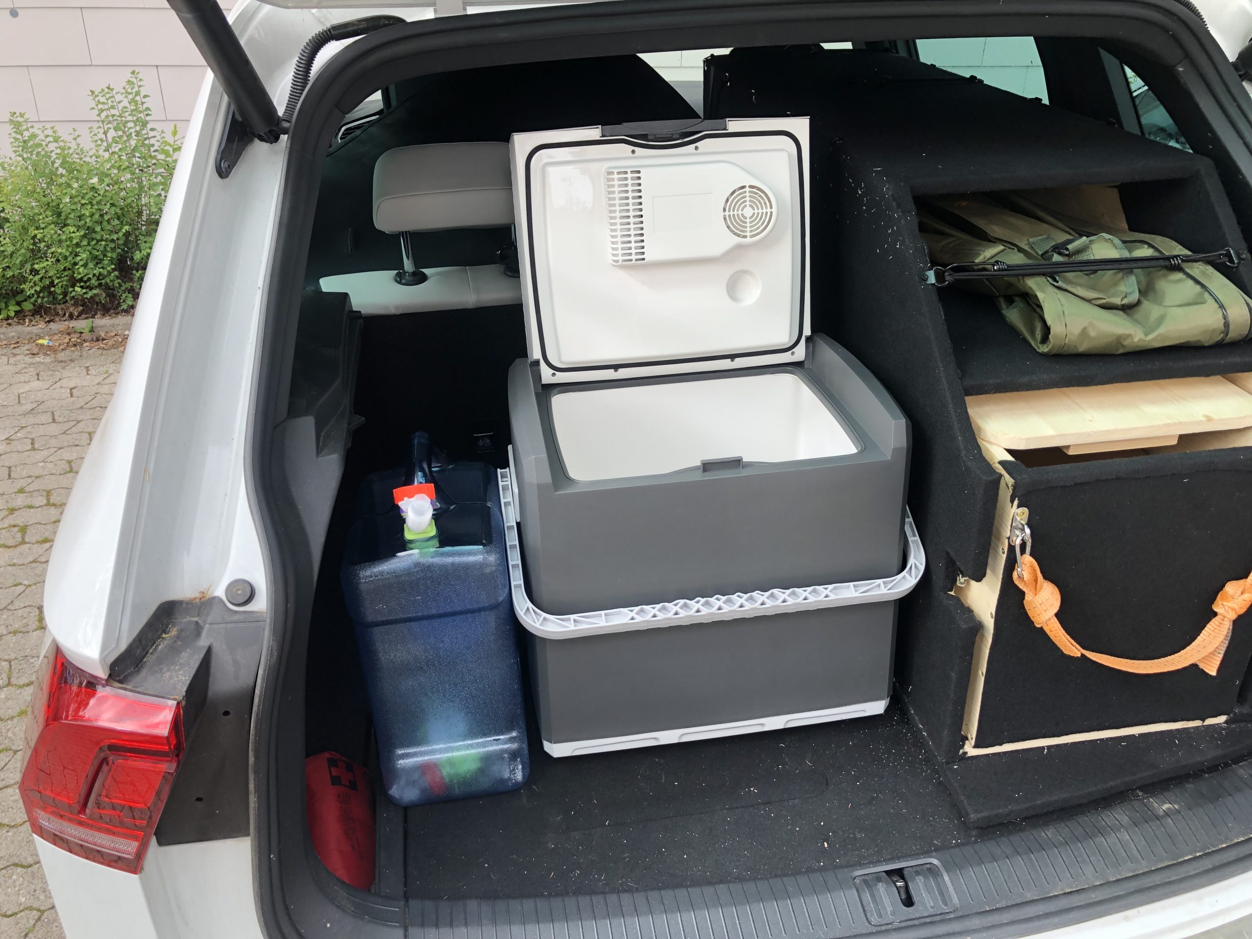 Zuerst wurden massig Skizzen angefertigt und überlegt wo denn welches Utensil im Auto Platz finden könnte. Am Ende entstand eine Holzlade, die die gesamte Kochstelle bietet und worin alles Geschirr, Besteck, Tassen, Teller und natürlich der Kocher Platz finden. Dazu gibt es einen Trinkwasserkanister und eine Kühlbox. Der Kofferraumboden wurde durch eine Holz-Platte mit eingebauter Luke ersetzt. Darunter werden die Schlafsäcke, Isomatten, der FirePit, Zeltzubehör, eine Axt, ein Spaten, eine Zeltplane, zwei Stühle und ein Tisch verstaut. Das Zelt passt genau zwischen Schublade und Dach. Die Kochlade nimmt etwa ein Drittel der Kofferraumbreite ein und so bleiben zwei Drittel des Platzes auf der Rückbank für Feelina. Im Cockpit vorne zeigt ein GPS Gerät unseren genauen Standort und die Meereshöhe an, wie auch die Neigung des Autos. Bis heute waren wir leider noch nicht draussen damit, zu viele Dinge hatten Vorrang. Aber sobald wir den „Volltest“ machen, erfahrt Ihr es natürlich gleich.