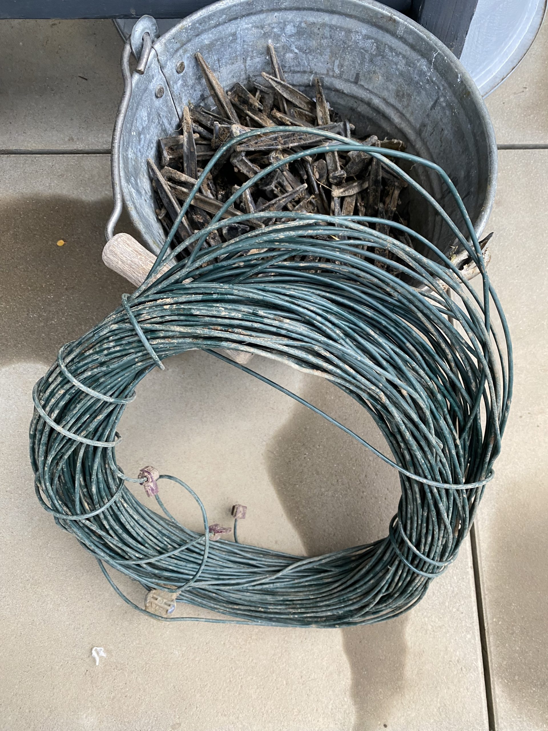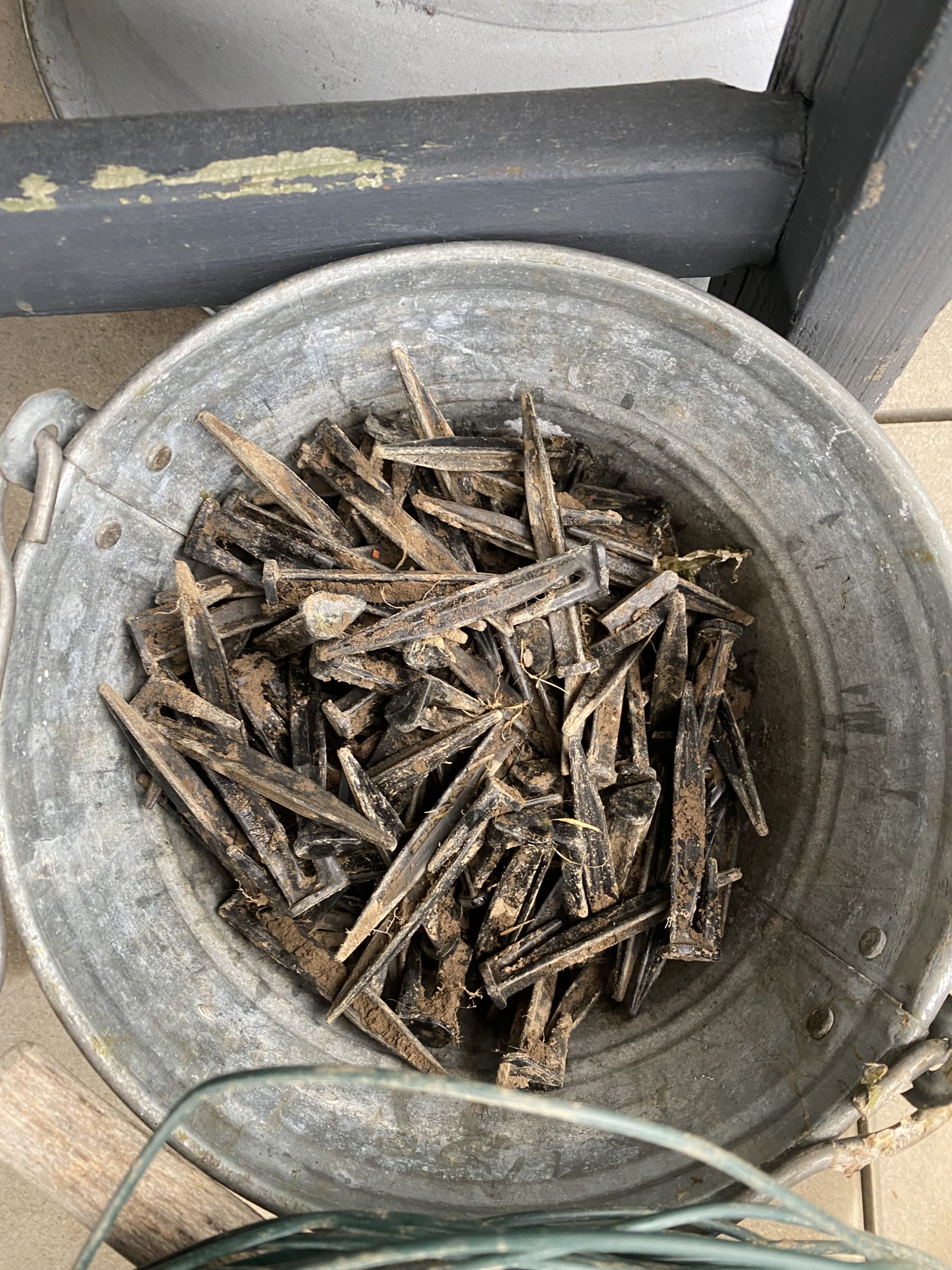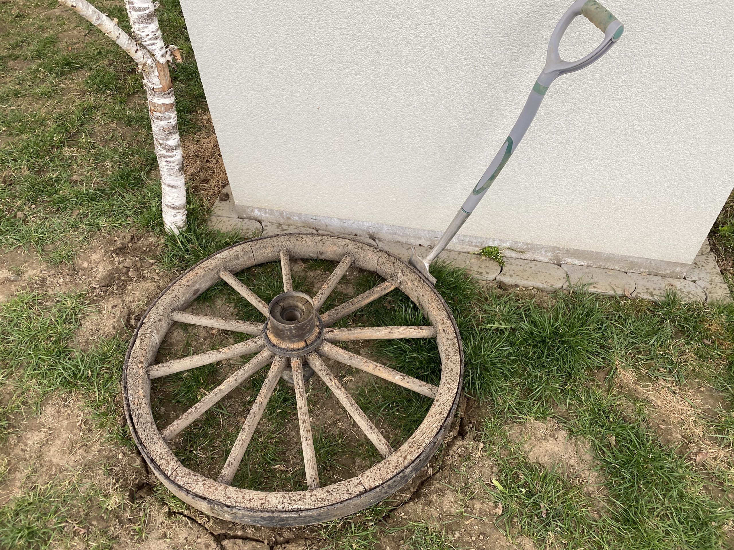 Am Sonntag darauf erstanden wir ein altes Wagenrad als Basis unseres Kräutergartens. Dazu haben wir vorab eine ungenutzte eingewachsene Leitung ausgegraben und entfernt. Damals muss wohl ein Mähroboter am Werk gewesen sein. Mit unzähligen Kunststoffnägeln wurde dieses Kabel an der Oberfläche fixiert. Doch im Laufe Zeit kamen diese von selbst heraus und wir mussten sie nurmehr einsammeln. Wir platzierten das Rad an der ‚Sonnenseite‘ und stachen den Rand mit dem Spaten ab. Das Material dazwischen verewendeten wir um den Abschluss der Terrasse aufzufüllen, da war mehr als genug Bedarf.